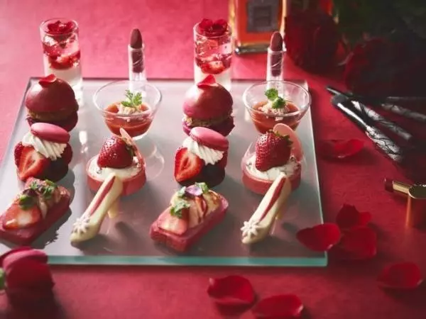 テーマは、真っ赤で可憐ないちごから着想を得た「ルージュ=赤」。苺とピスタチオガナッシュをサンドしたハイヒール型の白いボンボンショコラや、ラズベリーのジャムを入れたピンク色のタルト生地にクリームを絞ったメイクコンパクト風のストロベリータルト、実際に繰り出すことが出来るリップ型のストロベリーリップスティックなど、女性を美しく輝かせるコスメやハイヒールなどのアイテムを表現したスイーツが、可憐な赤で彩られたプレートを飾る。