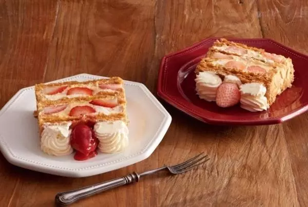 キハチの「ナポレオンパイ」は、苺が美味しくなる季節に登場する、毎年人気の限定スイーツ。旬の苺と生クリーム、濃厚でコクのあるディプロマットクリーム、パイ生地を重ね合わせることで生まれる、甘酸っぱい風味とパイ生地のサクサク食感が特徴だ。