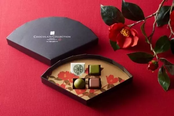 ボックスは黒扇型の和風デザイン。蓋を開けば、藤、椿、梅をモチーフにした日本の花木の屏風絵が描かれている。華やかなデザインは贈り物にも最適。大切な人へのバレンタインギフトにぜひ手にとってはいかがだろう。