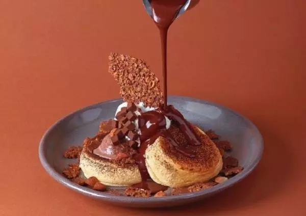 フリッパーズ、冬限定「奇跡のパンケーキ メルティーチョコレート」チョコソースをかけて仕上げる1皿