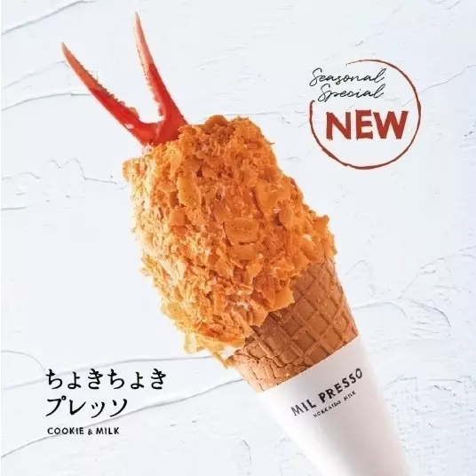 カニクリームコロッケがリアルに再現された「ちょきちょきプレッソ」。ソフトクリームにパイ生地を散りばめて、コロッケのサクサク食感を演出した。ふんわり優しく牛乳の香りがするソフトクリームには、カニフレークをトッピングすることで、甘じょっぱい味わいに。思わず写真に収めたくなるポップなビジュアルは注目だ。