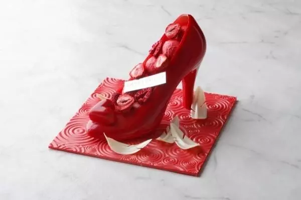 限定50個となるハイヒール型ショコラ「ショスュール」は、パレスホテル東京のショコラティエールが細部にまでこだわった手作りの1品。深紅色のヒールの中には、滑らかな口溶けと濃厚な後味の苺のトリュフショコラを入れ、シャンパン風味のハート形ボンボンショコラとドライベリーを添えた。