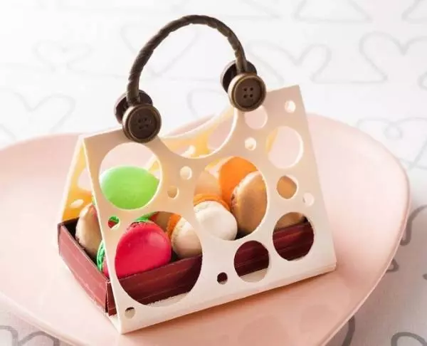 横浜ベイホテル東急のマカロン入りバッグ型チョコ、チョコレートで出来たボタンや持ち手