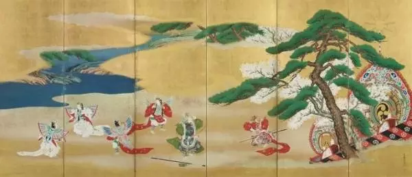 満開の桜の下で、陽気に宴を楽しむ人々の様子を描いた狩野長信作の「国宝花下遊楽図屛風」や、美しい桜の下で、厳かに舞楽が奉納されている様子を表現した「舞楽図屛風」といった屛風をはじめ、桜をあしらった武家女性の華やかな打掛「打掛鶸色縮緬地桜風景模様」や、佐賀の鍋島藩が将軍家などへの贈答用に焼いた「色絵桜樹図皿」など、当時の文化を色濃く映し出した春らしい作品が並ぶ。