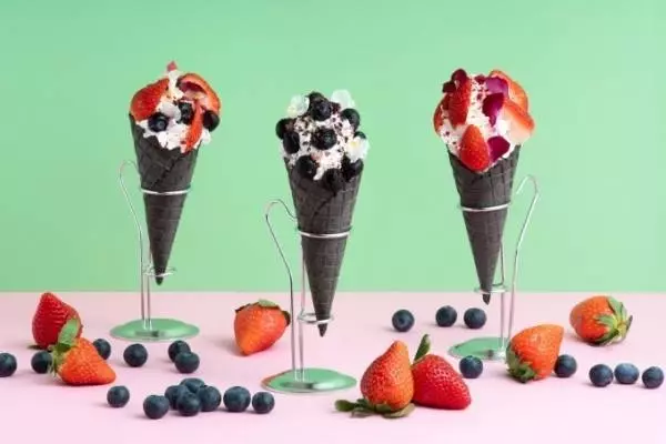 コーンにのった姿はソフトクリームのようだが、ソフトクリームでもショートケーキでもない新食感のスイーツ。極上のオリジナルクリーム「エスプーマ」をベースに、果物をデコレーションした。くだものが一番おいしくなるよう計算された、コクがあるがあっさりとした味わいの「エスプーマ」といちご、ブルーベリーなどのジューシーなフルーツの相性は抜群だ。