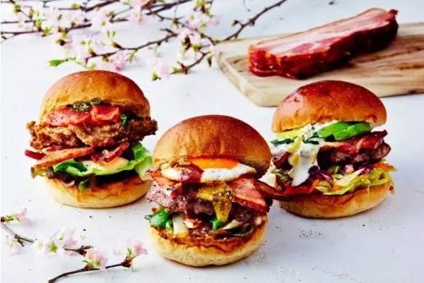 季節限定バーガ―には、桜の季節にちなんで、桜の木のチップでスモークしたオリジナル熟成ベーコン“桜スモークベーコン”をたっぷりと使用。加水を一切行わないこだわりの製法で仕上げたこのベーコンは、肉本来のジューシーな旨味をギュッと閉じ込めた贅沢な味わいが魅力だ。