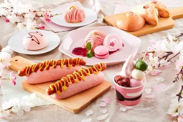 期間中展開されるのは、“桜の花びら”のように淡いピンクに色付いた春らしいメニュー。ソーセージを挟んだピンク色のホットドッグをはじめ、桜風味のソフトクリームに三色団子を飾った「桜サンデー」、“あまおう”使用のモンブランや桜ゼリー入りロールケーキ、マカロンを盛り合わせた「ピンクデザートプレート」など、見た目にも華やかな軽食やスイーツがラインナップする。