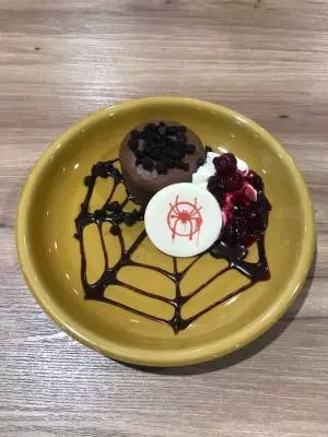 映画『スパイダーマン:スパイダーバース』をモチーフとしたメニューは、主人公・マイルスのスーツをイメージしたデザート「ブラックフォンダン」と、爽やかな「ブルックリンブルー・ウェブソーダ」などをラインナップ。コラボレーションメニューを注文すると、限定ステッカーがプレゼントされる。