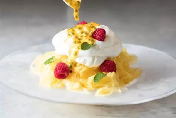 台湾式ふわふわかき氷は、程よい酸味が後を引くひんやりスイーツ。口の中でふわりと溶けてなくなるマンゴーとパッションフルーツ風味の氷の上に、クリーミーなコンデンスミルクをたっぷりと乗せた。上から酸味のあるパッションフルーツソースをかけて、後を引くさっぱりとした味わいのスイーツに仕上げた。