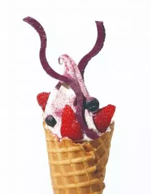 5月は、心地よい香りのスミレ風味のソフトクリーム「アンヴィ」。カシスやブルーベリーといったベリーをのせ、ジューシーな甘酸っぱさをプラスした。果実と一緒に飾った波のようなマカロンカシスの軽い食感も楽しい。