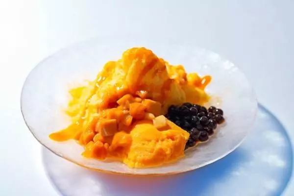 中華の名店「蔭山樓」が提案するのは、マンゴー味の染み込んだふわふわ食感のかき氷をベースに、マンゴー果肉をふんだんにトッピングした一品。仕上げにモチモチのブラックタピオカとマンゴープリンをトッピングした、贅沢な台湾風かき氷だ。