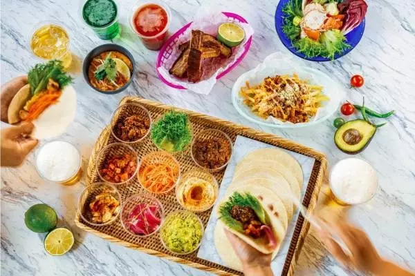「ホワイト&スカイ -プールサイド ビア ガーデン-」は、スパイスが効いたラテン料理を中心としたメニューで構成。シグネチャーメニューとなるタコスは、チリコンカンや、コクのあるアボカド、トマト、タマネギを混ぜ合わせたワカモレなど9種類の色とりどりの具材を好みで包む、セルフスタイルで提供される。