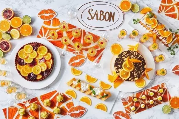 コラボレーションビュッフェは、SABONの爽やかなジンジャー・オレンジコレクションが着想源。ジューシーなオレンジにスパイシーなジンジャーが合わせた甘くスパイシーな香りを、色鮮やかなビュッフェメニューで表現した。
