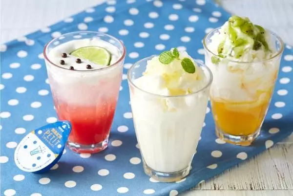 2018年に次ぐ4度目のコラボレーションとなる今回は3種類の新作ドリンクを展開。微炭酸のすいかソーダに塩ホイップを重ねた「すいかソーダ with 『カルピス』PETIT」は、注文者自身が希釈ポーションタイプの「カルピス」PETIT(プチ)を加えて完成させる一杯。すいかを彷彿とさせるビジュアルも、遊び心に溢れている。