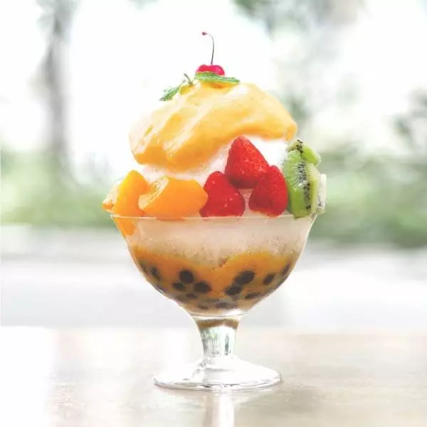 自家製ミルクシロップを使用したミルク氷の上には、みかんや黄桃を使用したフレッシュな味わいが魅力のエスプーマソースをかけた。下層ソースにはタピオカをたっぷりと。さらに、みかん、パイン、バナナを加えて夏の暑さを吹き飛ばす、食感も楽しい限定メニューに仕上げている。