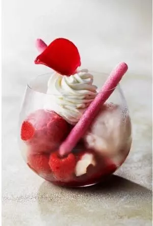 華やかな印象の「イスパハン」は、ローズ風味のライチソルベやフランボワーズソルベに、ライチ、フランボワーズといった果実、フランボワーズのソース、シャンティクリーム、マカロンを合わせたパフェ。