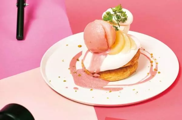 ジューシーな桃を豪快に丸ごと使用したのは「丸ごと桃とリコッタチーズのパンケーキ」。上品な甘みの桃とさっぱりとしたリコッタクリーム、ふわふわもちもちのパンケーキがマッチした贅沢な一品に仕上がっている。