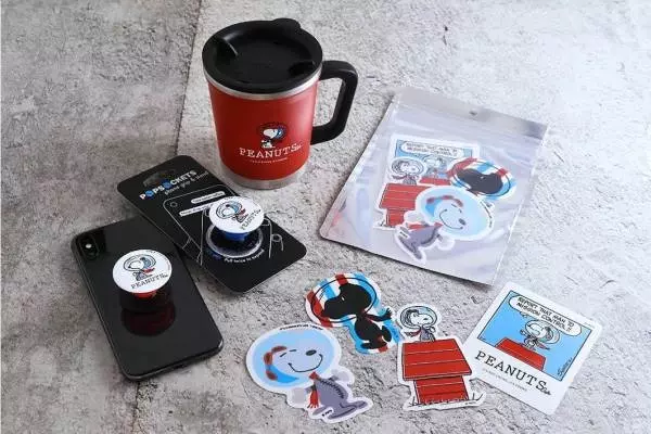 “アストロノーツスヌーピー”を配した真っ赤なマグは、温かい飲み物でも冷たい飲み物でも、その美味しい温度を保ってくれる優れもの。その他、レッドやブルーが映える携帯用アクセサリー「ポップソケッツ・グリップ」や、ステッカーのオリジナルデザインも用意する。