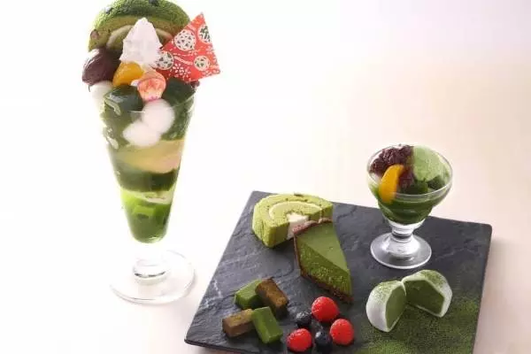 茶房では、オープンを記念して、通常より一回り大きなグラスで作るこだわりの宇治抹茶パフェに渋皮栗、丹波黒豆、和のチョコレート、宇治抹茶ロールケーキを盛り付けた「祇園パフェ」が限定メニューとして登場する。