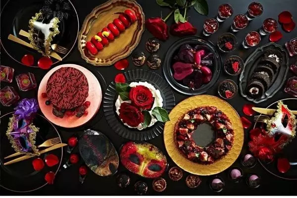 「ハロウィンスイーツビュッフェ マスカレード」のテーマは“仮面舞踏会”。ビュッフェ台には、赤と黒に彩られたスイーツがずらりと並び、シックでミステリアスな大人のハロウィンを演出する。