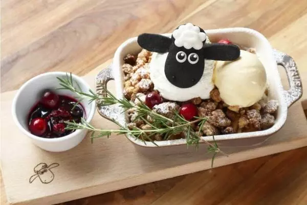 カフェには、個性豊かなキャラクター達をモチーフにしたメニューが勢ぞろい。目玉となるスイーツには、甘酸っぱいりんごのコンポートにサクサクのクランブルをのせて焼き上げた「ショーンのアップルクランブル」や、カスタードやスポンジケーキなどを層状に重ねたイギリス伝統スイーツ“トライフル”に、ショーンのクッキーやフルーツを飾った「ショーンのフルーツトライフルタルト」などがラインナップ。