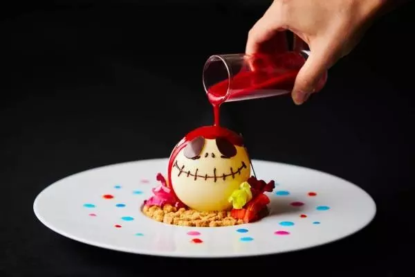 「ハロウィンアーモンドミルクパルフェ」は、骸骨をイメージした球体のホワイトチョコレートに、ココアスポンジ、ラズベリー、アーモンドミルクムース、ピスタチオアイス、甘く煮詰めたベリーコンポートを詰めこんだスイーツ。仕上げに、真っ赤な温製ストロベリーソースをまわしかけ、チョコレートを溶かしてから食す、ライブ感のある一皿となっている。