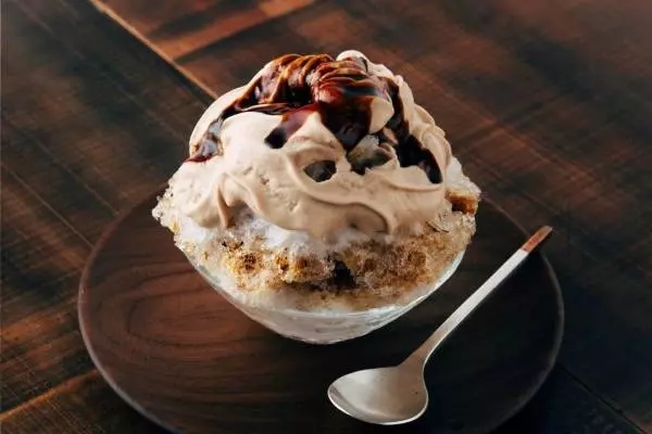 アコメヤ茶屋では、アッサムティーと本格チャイマサラを使用した「チャイミルク かき氷」を用意。氷を口に含むと香り高い茶葉の香りが口いっぱいに広がる。