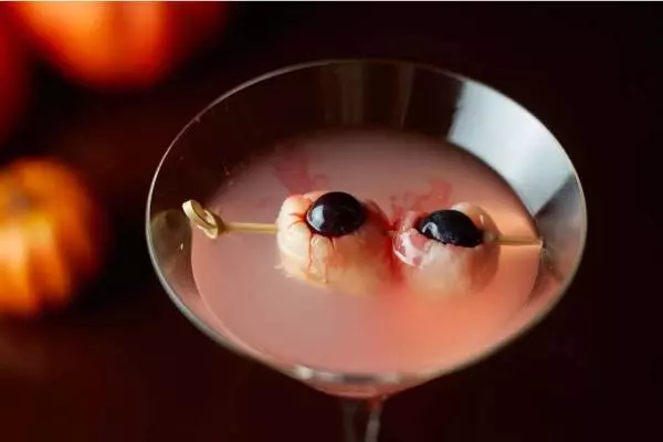 「目玉入りカクテル」は、ウォッカとライチジュースを合わせ、スッキリとした甘みのある味わいが特徴。グラスに浮かんだ充血した目玉は、ブルーベリーやラズベリーを使い不気味な見た目に仕上げた。