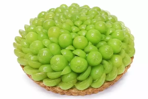 「白ぶどう」のケーキ、「山梨県 笛吹産 シャインマスカット『富士山の彩』ケーキ」には、「富士山の彩(ふじやまのいろどり)」をデコレーション。パリッとした皮の食感と濃い甘みが魅力のシャインマスカットを、クリームチーズの上に美しく飾り付けた。