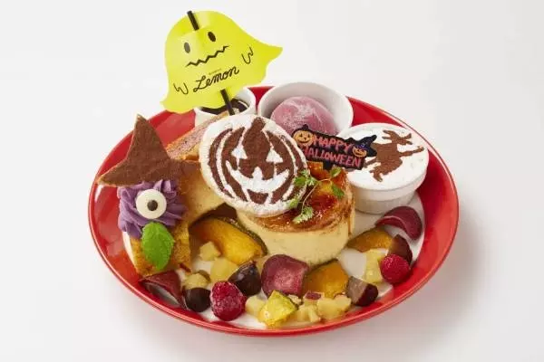 パンケーキ専門店バター「秋の味覚 焦がしハロウィンパンケーキ」紫芋のクリームのおばけをトッピング
