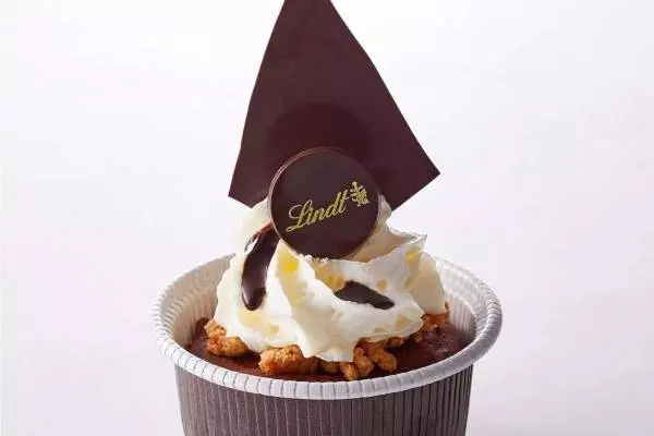その他、サクサク食感のヘーゼルナッツのクルスティヤン、ダークチョコレートソース、リンツのロゴ入りチョコレートをトッピングし、食感のアクセントをプラス。できたての美味しさをカジュアルに楽しめる、カップデザートで提供される。