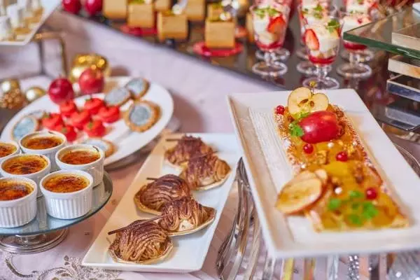 白雪姫のりんごタルト/キャラメルとマロンのムース/7人の小人のシュークリーム/フォレノワール(チョコレートとダークチェリーのケーキ)/アールグレイのクレームブリュレ/りんごのマカロン/クリスマスショートケーキ/ショーソンポム/森のベリーヌ(プラリネアーモンドを使ったパフェ)/クリスマスツリー モンブラン(ピスタチオクリームのモンブラン)、軽食など