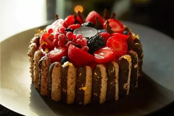 アマン東京のクリスマスケーキ2019、鮮やかなベリーや金箔をあしらったケーキをビスキュイで囲んで