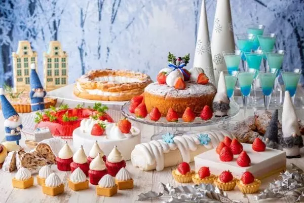 ビュッフェテーブルには、真っ白なデザートや苺のスイーツがずらり。ホテル特製の「ストロベリーショートケーキ」はクリスマス限定のアレンジ。雪の降り積もったような「ミルキーノエル」には、雪の結晶のモチーフをあしらってかわいらしい見た目に。ほかにも、鮮やかに苺をデコレーションしたココナッツムースやリース型ゼリーもラインナップする。
