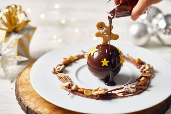 「クリスマスオーナメントシ ョコラパルフェ」は、チョコレートで出来た球体に、スターやジンジャーマンを飾った“クリスマスオーナメント”のようなパルフェ。球体の中には、チョコムースや生クリーム、バニラアイス、オレンジなどをたっぷりと重ねて。食べる前に、熱々のチョコソースを上からかけることで、オーナメントが“とろ~り”溶け出し、よりリッチな味わいを楽しむことができる。