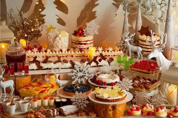 京王プラザホテルが2019年に贈る「クリスマススイーツブッフェ」のテーマは“ホワイトクリスマス”。北欧のホワイトクリスマスをイメージした装飾を施した店舗で、クリスマスのならではのスイーツを約30種の豊富なバリエーションで用意する。