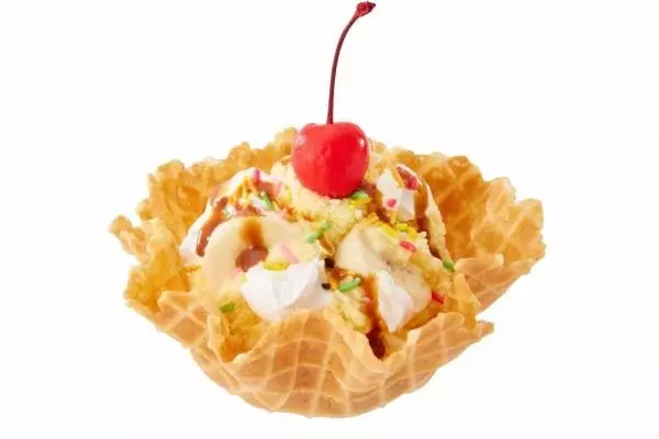 “まるちゃん”をモチーフにした「まるちゃんのプリン・ア・ラ・モード」は、“まるちゃん”の好きなプリンをアレンジしたアイスクリーム。卵のコクが感じられるカスタードプリンアイスクリームにバナナ、ホイップクリーム、レインボースプリンクル、キャラメルソースをミックスし、仕上げに真っ赤なさくらんぼをトッピングしている。
