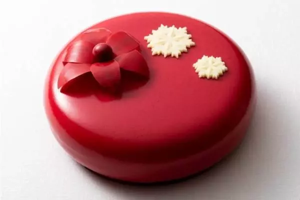 艶やかなクランベリーソースのコーティングに、真っ赤な花と雪の結晶を飾ったのは「ハイビスカス・ピスタチオ」。土台となるケーキには、香ばしいピスタチオムースにハイビスカスとベリーのクリーム、クランベリージャムを忍ばせている。ラズベリーのパールショコラとピスタチオのキャラメリゼで、食感にアクセントをプラスした。