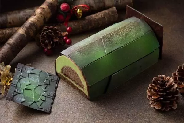「チョコミントのブッシュドノエル」は、ヒルトン名古屋が2019年のクリスマスに贈るスペシャリテ。ココアのスポンジでチョコミントケーキを包み、さらにその周りをチョコレートでコーティングした。ビターなチョコレートと爽やかなミントが香るムース、コーティングするチョコレートのパリパリ食感が絶妙なハーモニーを奏でる。