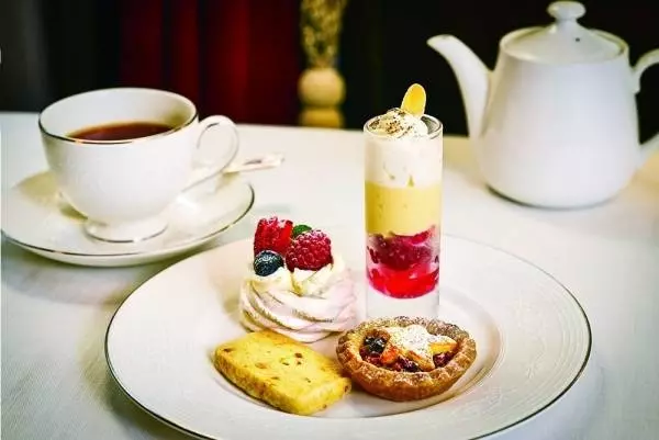 プレートには、ベリーをのせたクリスマスメレンゲやグラススイーツのシェリートライフル、英国ならではのショートブレッドなどを用意。ドリンクはポットで紅茶が提供されるので、友人や家族を誘って楽しいティータイムを楽しむのもグッド。