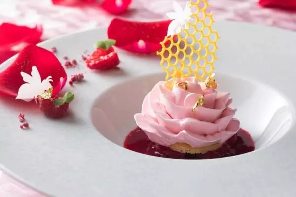 マリーアントワネットの誕生日を祝うべく考案されたスイーツは、花びらを一枚一枚絞り、バラに見立てた繊細な仕上がりと味わいが楽しめる「ヴァシュランをローズに見立て柚子とマヌカハニーのグラス マリーアントワネットティーの香るフランボワーズクーリと共に」と、ルビーカカオを使用したピンク色のチョコレートで見た目にも可愛らしいパフェ「マリーアントワネットティーのパフェ ルビーカカオをあしらって」の2種類。