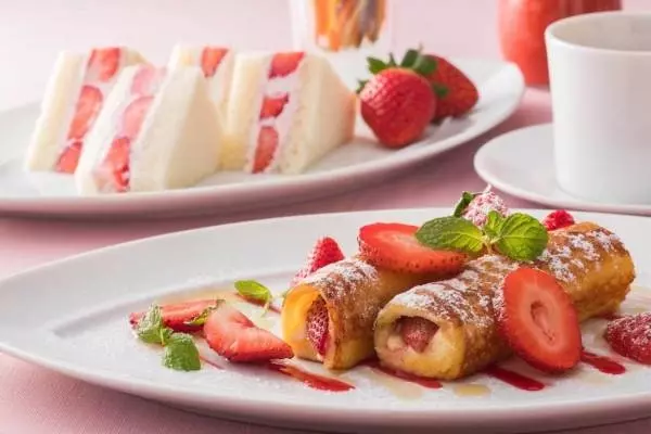 ティータイムのスイーツセット「ストロベリートリート」では、「苺のフレンチトースト ロール仕立て」「苺のサンドウィッチ」の2品からメインディッシュをチョイス可能。ロール状に仕上げたフレンチトーストは、卵をたっぷりと含ませた風味豊かなパンで、なめらかな口当たりのクリームチーズと苺を巻き上げた。