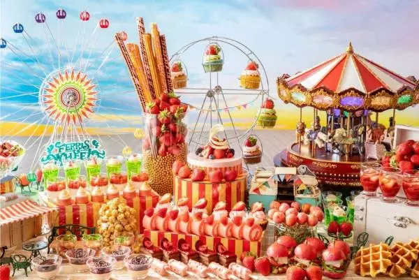 「ストロベリー・カーニバル・スイーツビュッフェ」は、メリーゴーランドや観覧車、輪投げやローカルフードの屋台などが立ち並ぶカーニバルの世界観を表現したいちごのスイーツビュッフェ。カラフルなスイーツを揃え、カーニバルを心待ちにするワクワク感を表現している。
