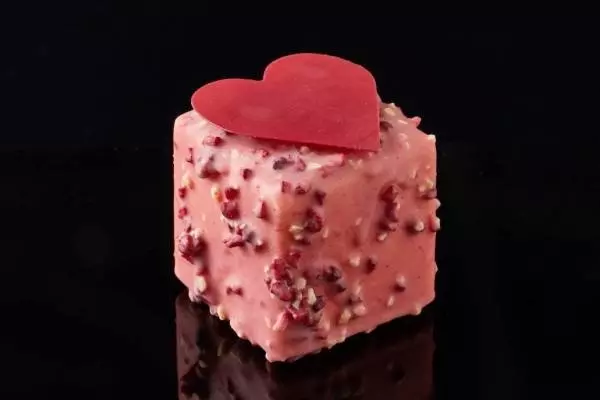 45階に位置する「ラ・ブティック」のキューブ型ケーキが、バレンタイン期間限定で、唇から着想したダークチョコレートムースケーキ「ラブリップ」に。ブラックペッパーを効かせたレッドカラントのゼリーと、程よく甘いハチミツのガナッシュの絶妙なハーモニーを楽しめる。