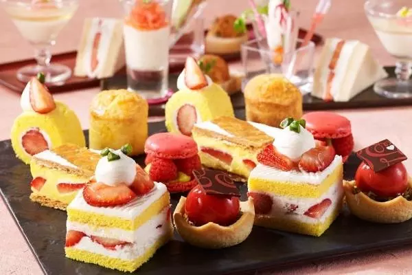 スイーツは、定番のショートケーキをはじめ、ロールケーキやミルフィーユなどを用意。イチゴの食感をしっかりと味わえるよう、大きめにカットしサンドした。また、イチゴのクリームサンドウィッチやイチゴドレッシングをかけて味わうベジタブルスティックなど、セイボリーにもイチゴを取り入れている。