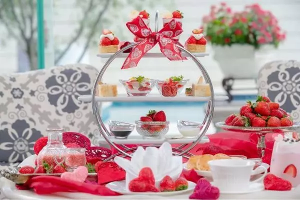 スイーツには、いちごを利かせたタルトやグラスショート、ムースに加えて、“ラブ”にちなんだハート形ショコラも登場。おなじみのスコーンは、自家製のいちごジャム・クロテッドクリーム・ハチミツとともに味わえる。