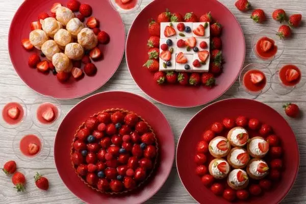 さらに、ルビーチョコレートを使ったアーモンドチョコレートや、シャンパーニュを合わせたストロベリーゼリーなど、華やかなメニューが登場。もちろん、あまおうをたっぷりのせたストロベリータルトや、いちごと生クリームの味わいが引きたつショートケーキなどの定番スイーツも存分に楽しめる。