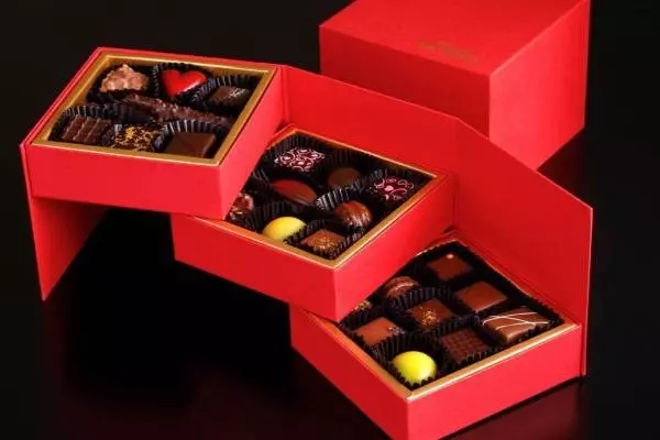 ホテルニューオータニがバレンタインのために用意したのは、シェフパティシエのこだわりが詰まった「オリジナルボンボンショコラ」。真っ赤なギフトボックスに色鮮やかなボンボンショコラを3段詰め合わせている。