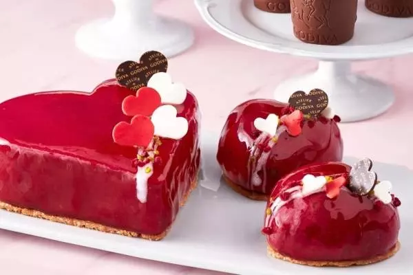 アトリエ ドゥ ゴディバのバレンタインスイーツ、ハートのカシスケーキやいちご型マカロン