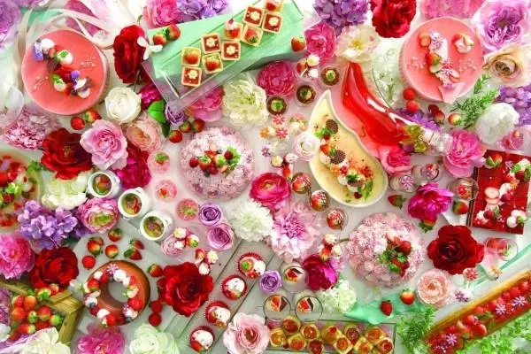 いちごスイーツのメニューは全部で約35種。「パーティーブーケに見立てたフレジェ」や「心ときめく いちごのフラワーゼリー」「薔薇の花咲くアップルパイ」など、カラフルな花をモチーフにした可憐なラインナップが揃う。